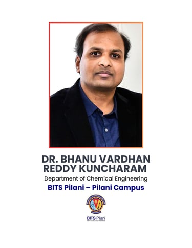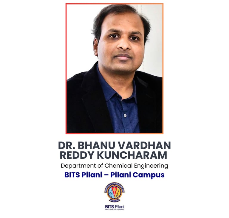 Dr. Bhanu Vardhan Reddy Kuncharam, Associate Professor, Department of Chemical Engineering, BITS Pilani, specializes in membrane-based gas separation, CO₂ capture and utilization, biogas upgrading, and computational fluid dynamics. With 20 peer-reviewed publications, he is been a PI/Co-PI projects worth ₹4.5 crore funded by MNRE, DST-SERB, and other agencies, including green hydrogen production and separation membranes.